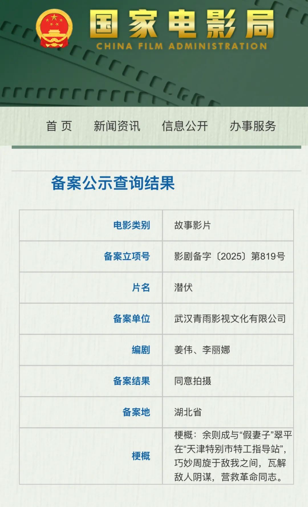 国家电影局最新备案公示显示◈ღ✿,电影《潜伏》立项◈ღ✿,编剧为姜伟(电视剧版《潜伏》导演◈ღ✿、编剧)◈ღ✿、李丽娜◈ღ✿。